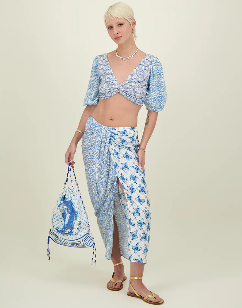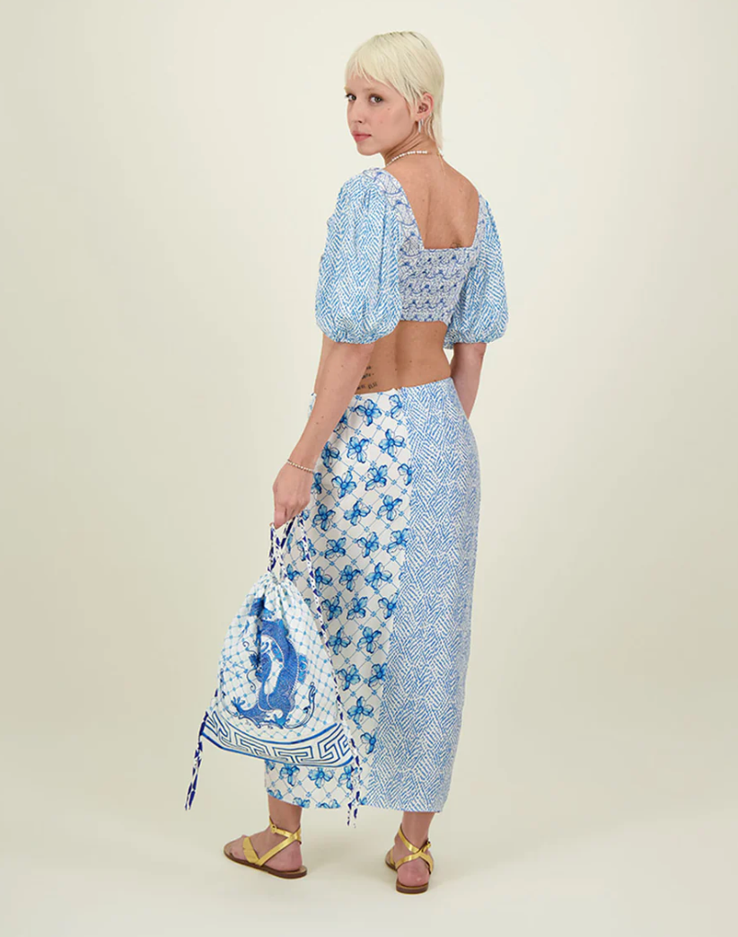 Tie front slim fitting midi skirt in shades of blue and lavender. One side of the skirt is a dotted print, the other side is a floral print with a geometric background. The tie creates a beautiful draped look in the front.