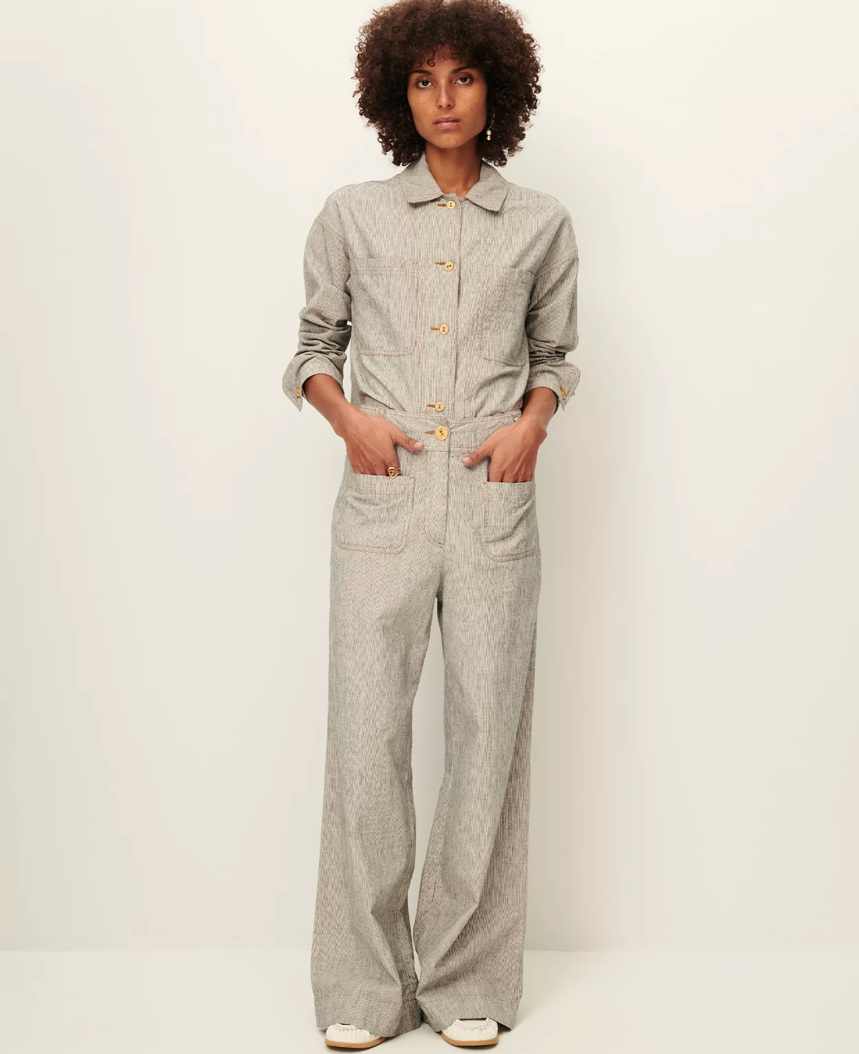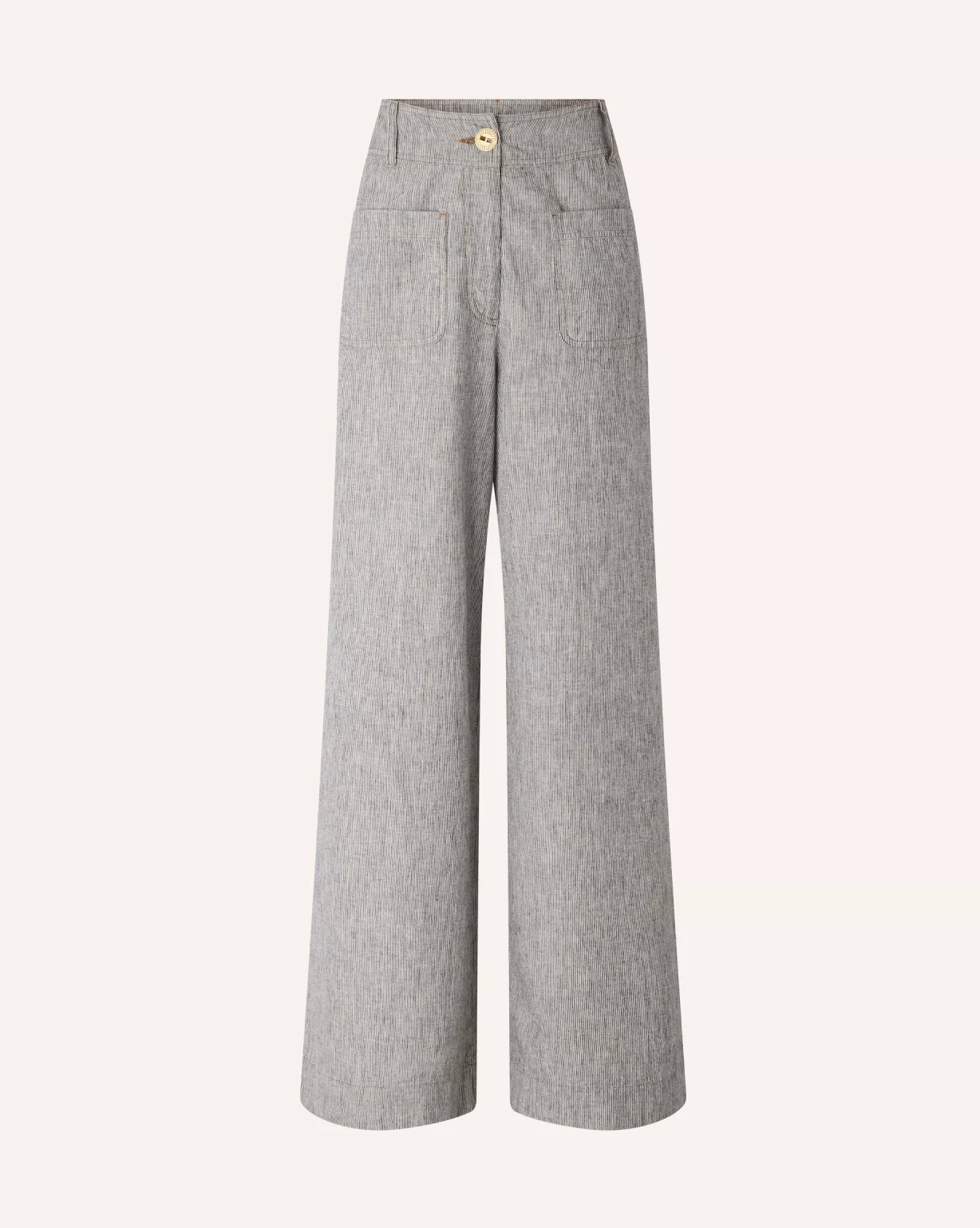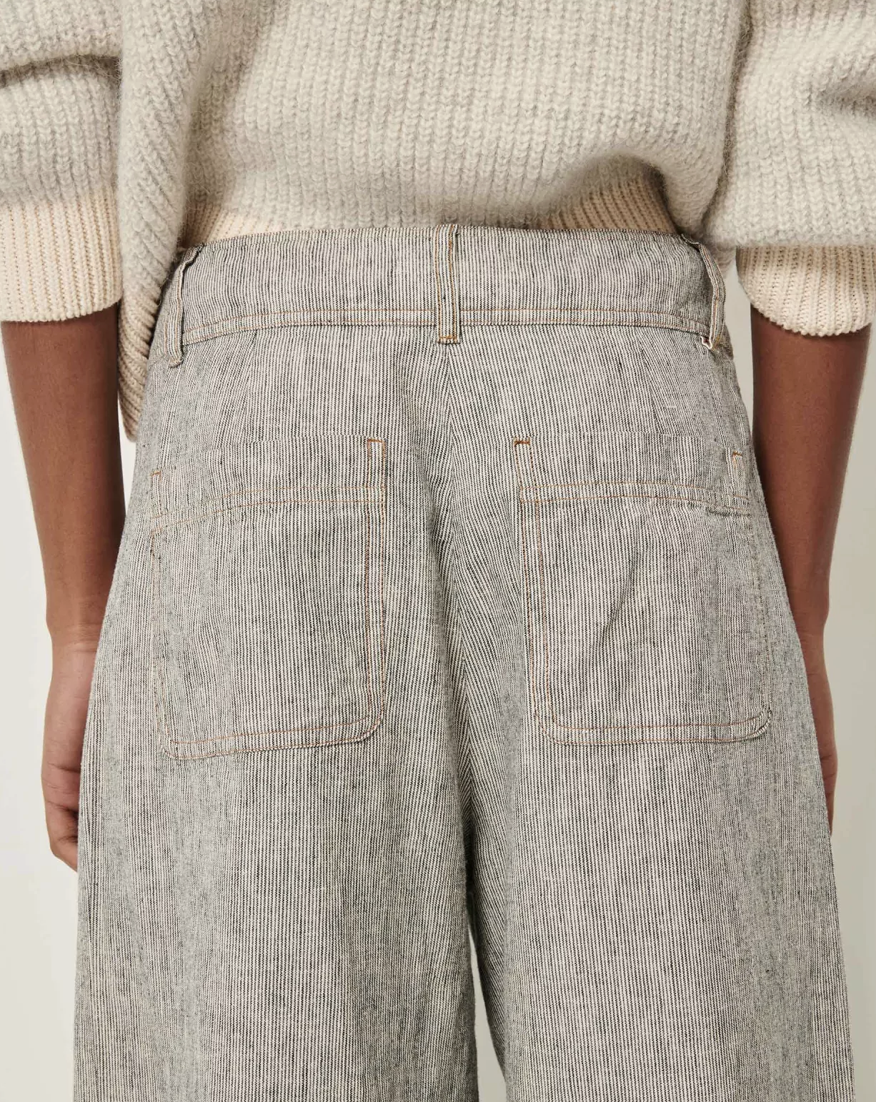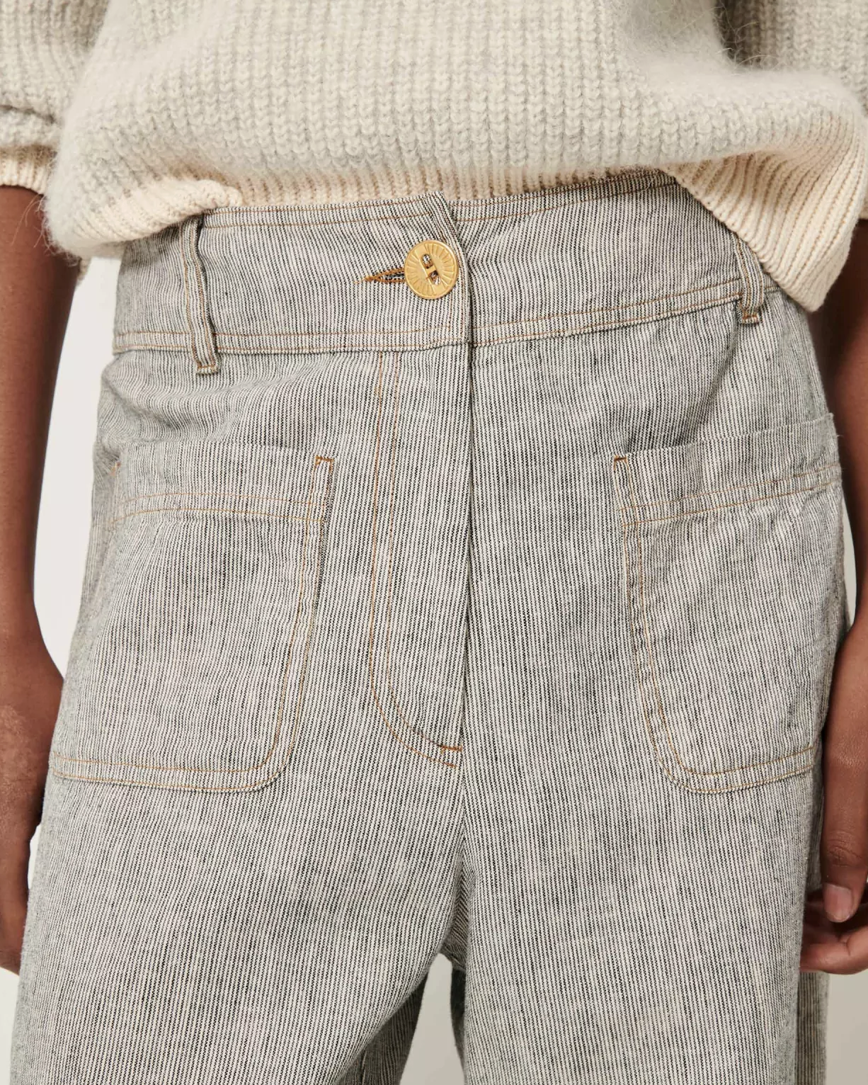 High-rise flared pants in two-tone striped textured slub-yarn linen/cotton fabric, woven in Spain, with contrasting topstitching detail.
