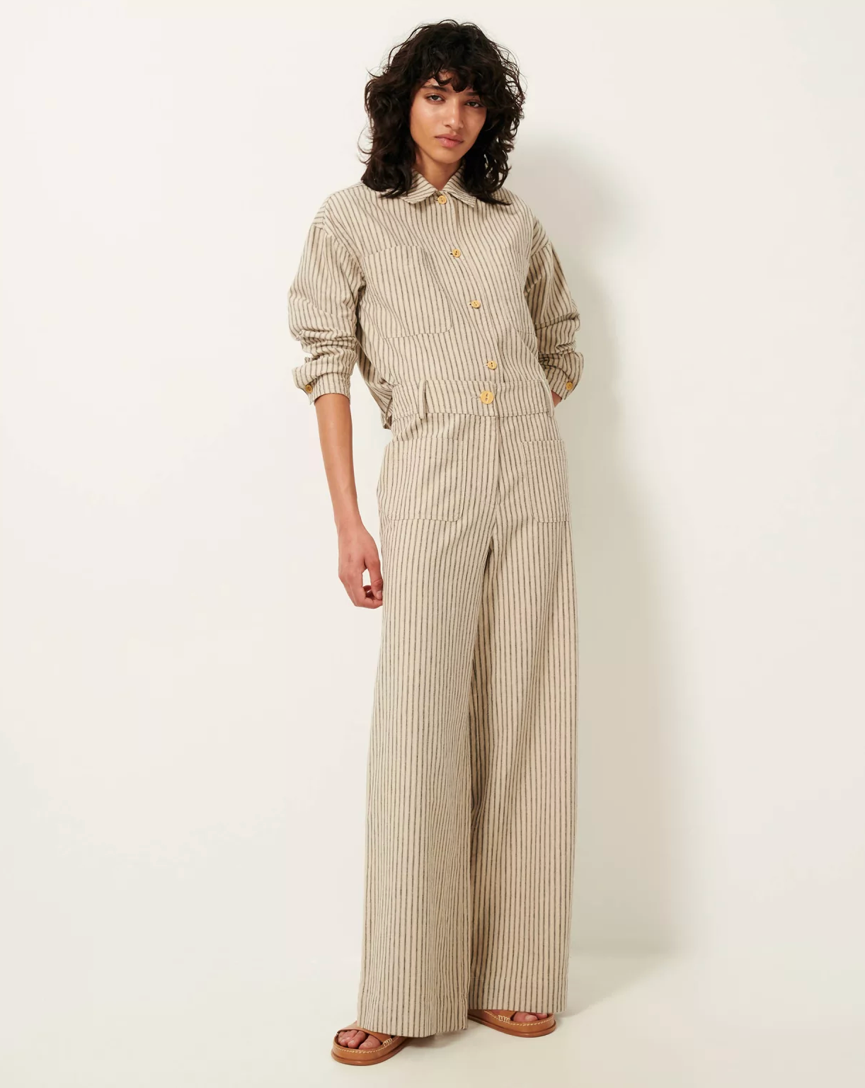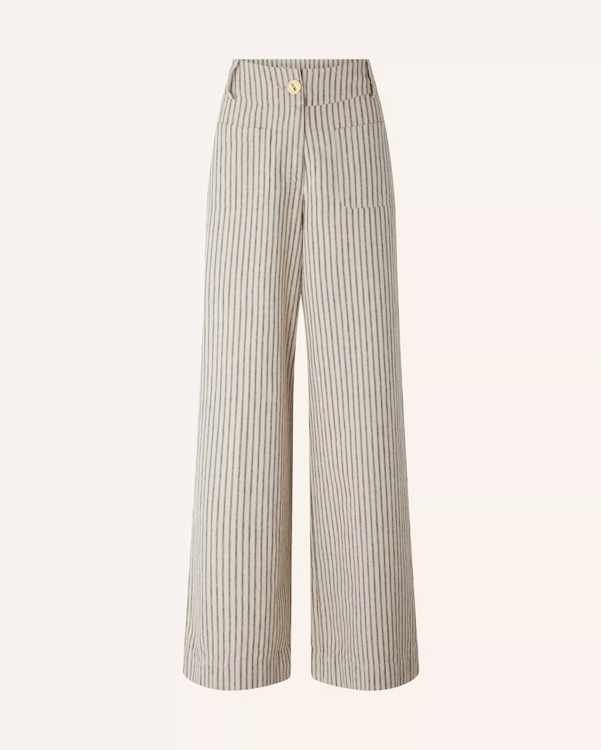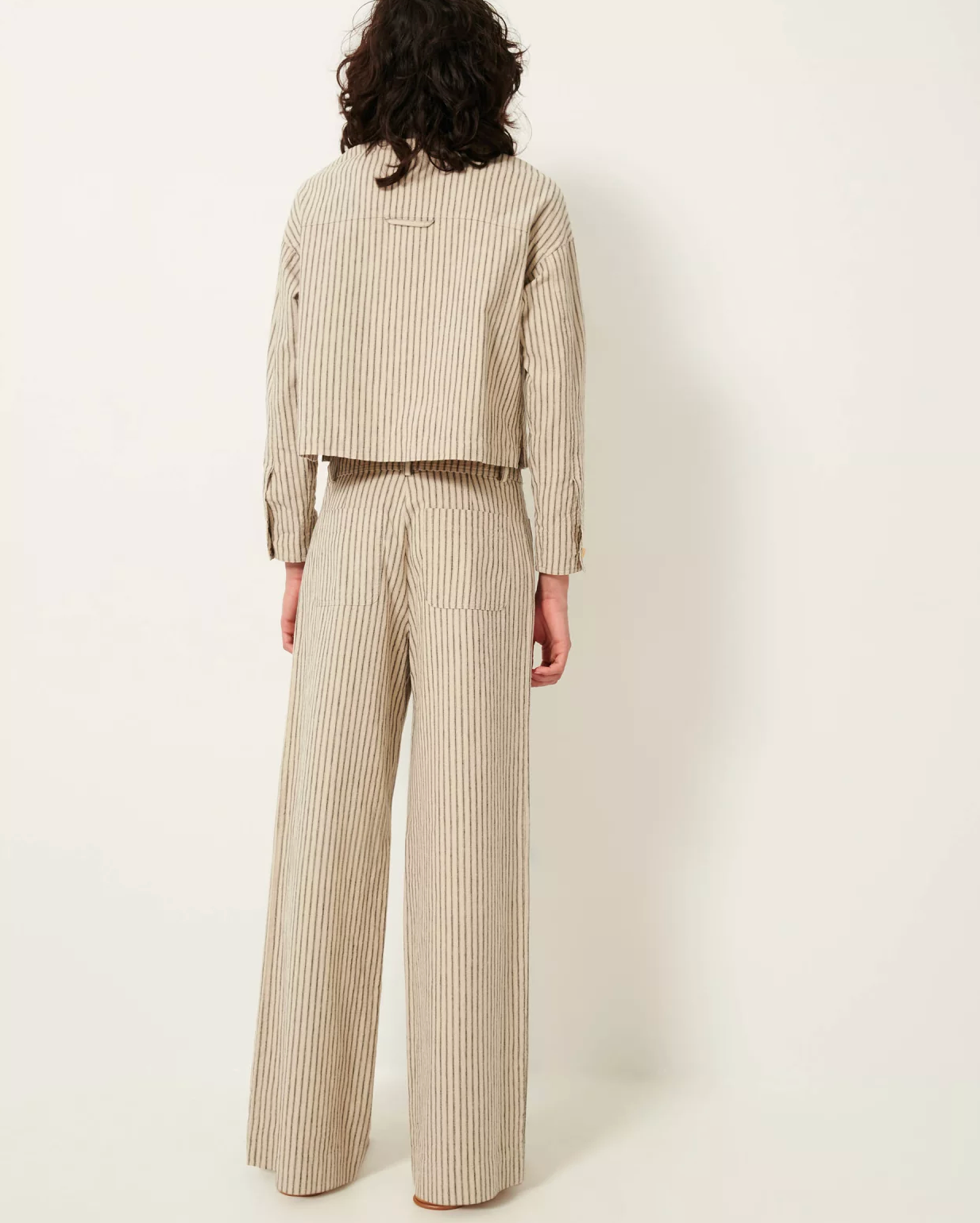High-rise, wide-leg straight trousers in a rustic slub yarn fabric with two-tone zephyr stripes, finished in Spain.