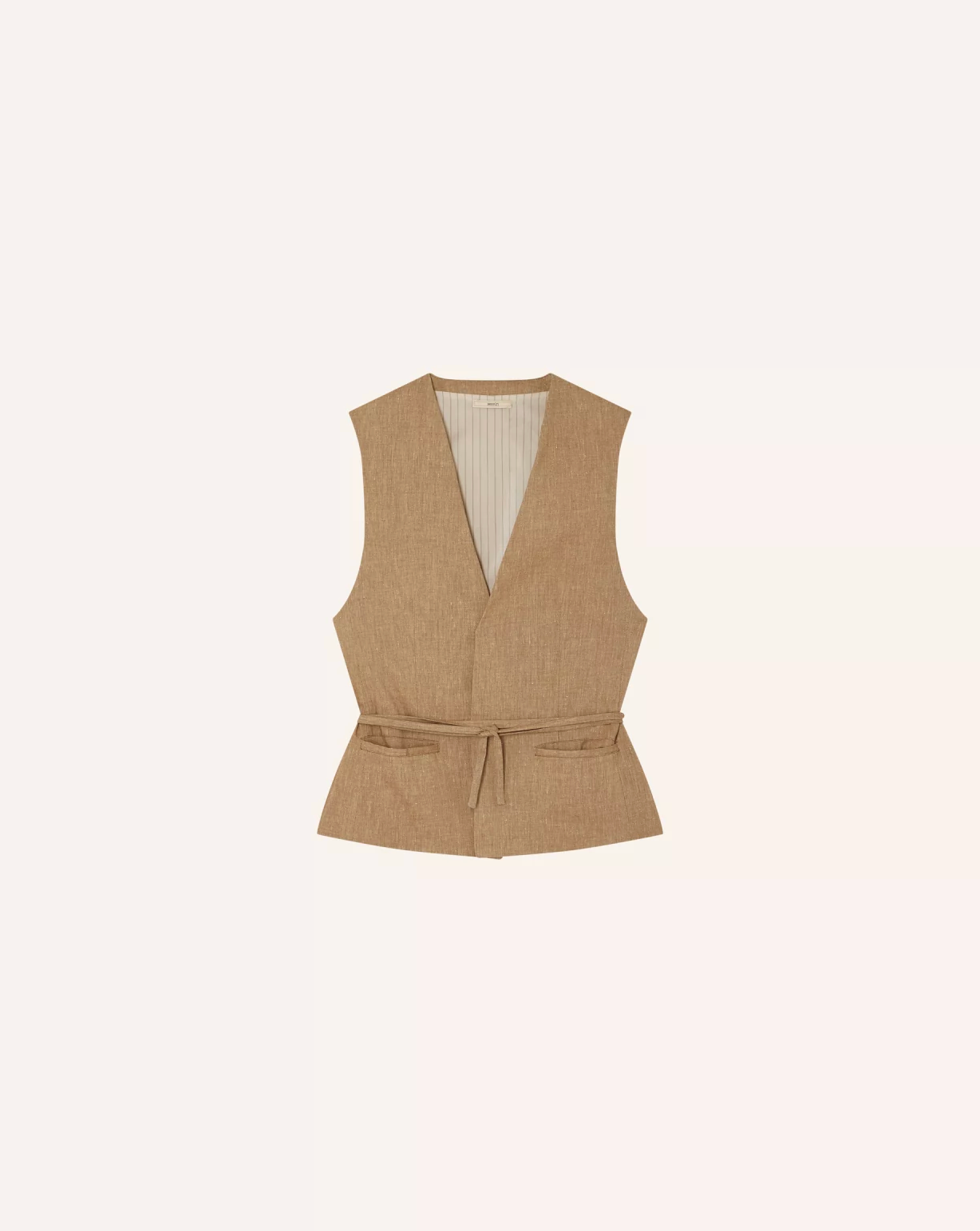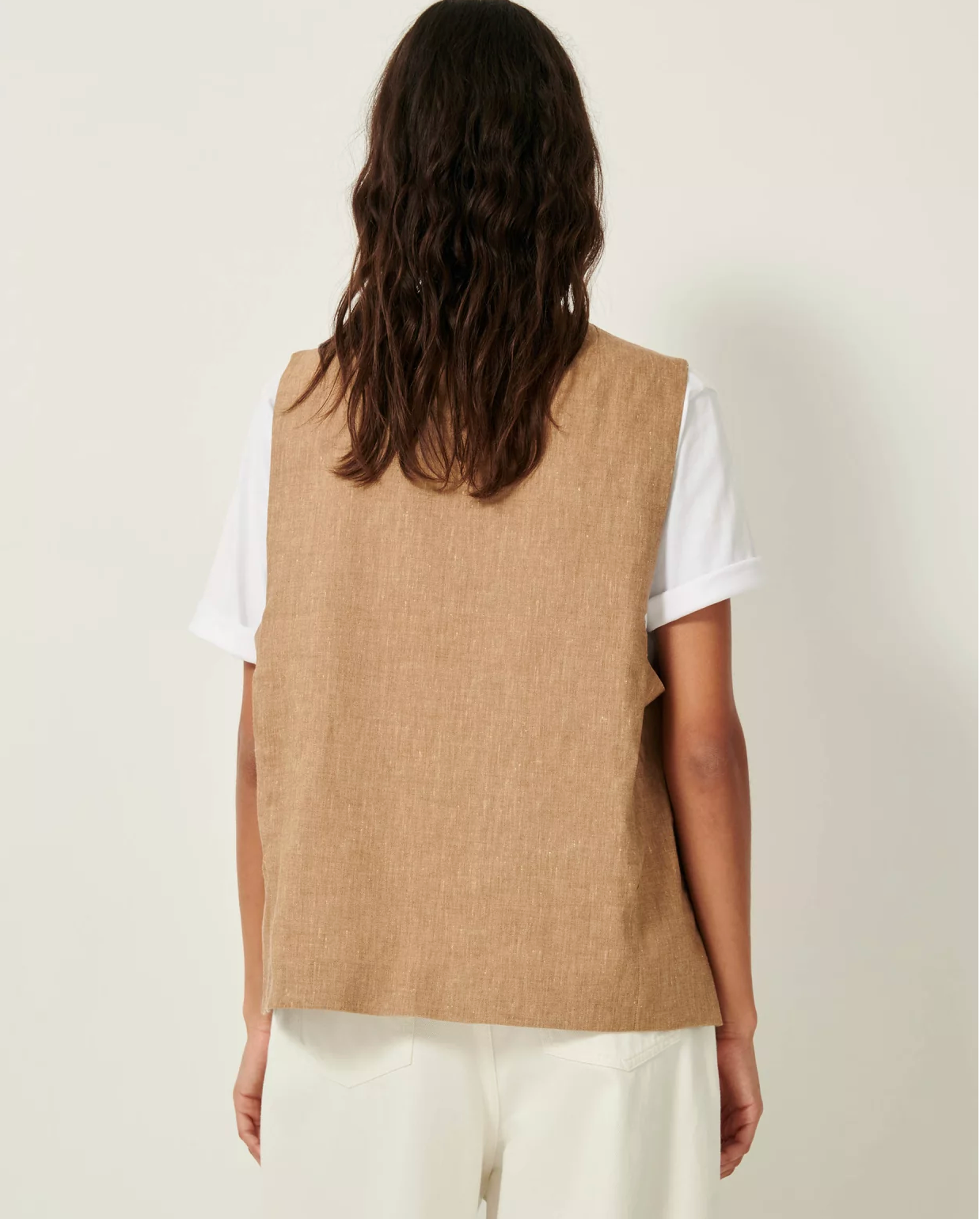 Sleeveless suit-style jacket in colored twisted slub linen chambray.