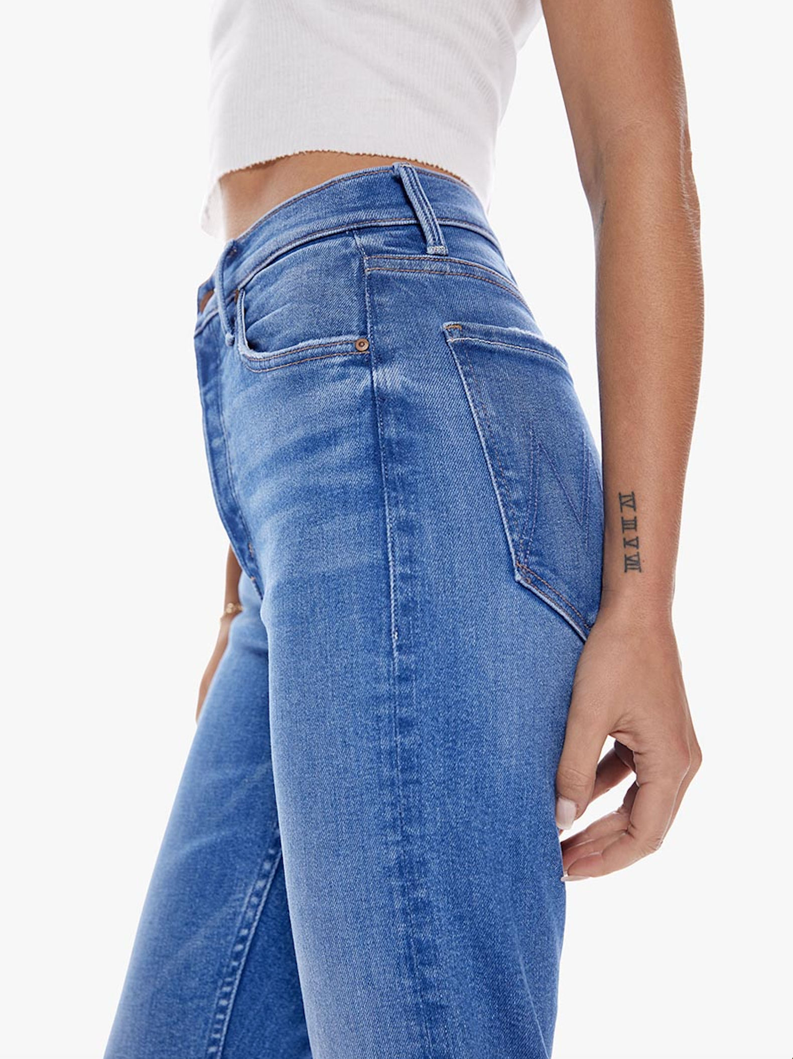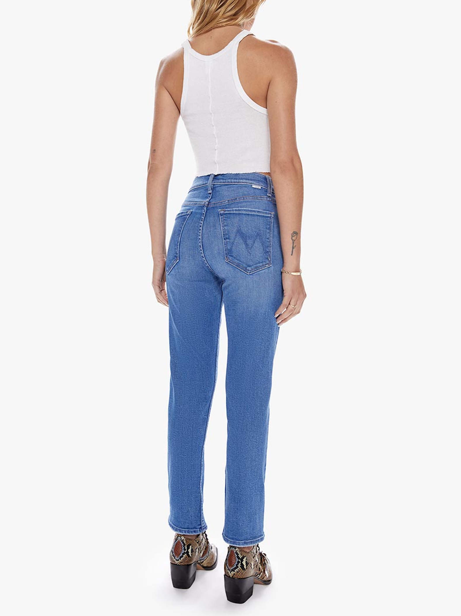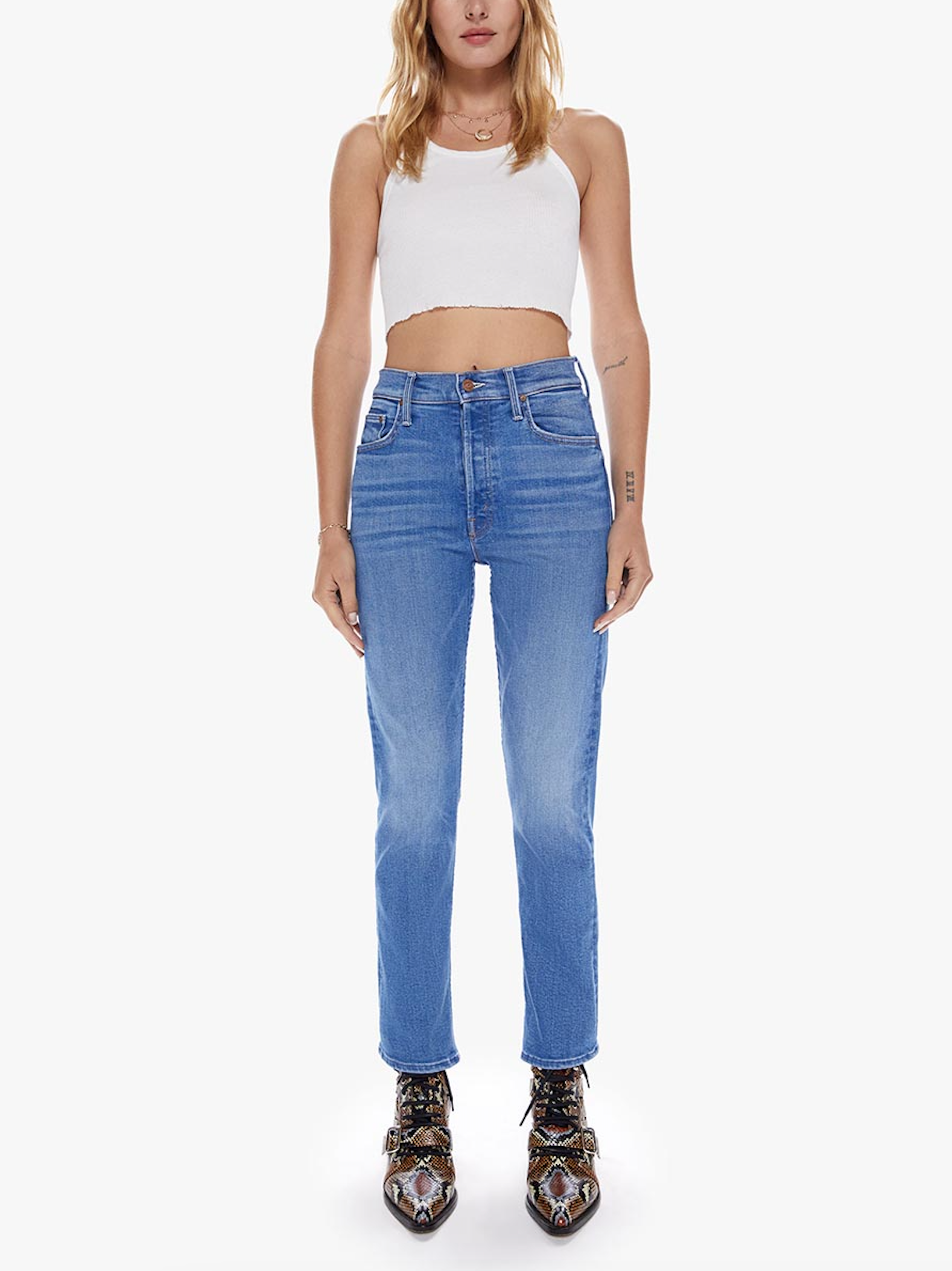 Mother denim's high-rise straight leg with a button fly and a cropped inseam. Made from stretch denim, Layover is a bright mid-blue wash with whiskering and fading throughout.