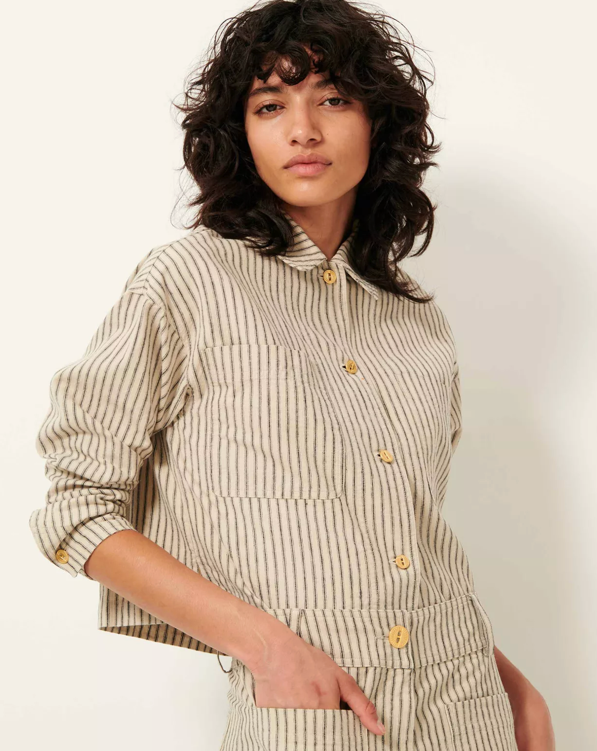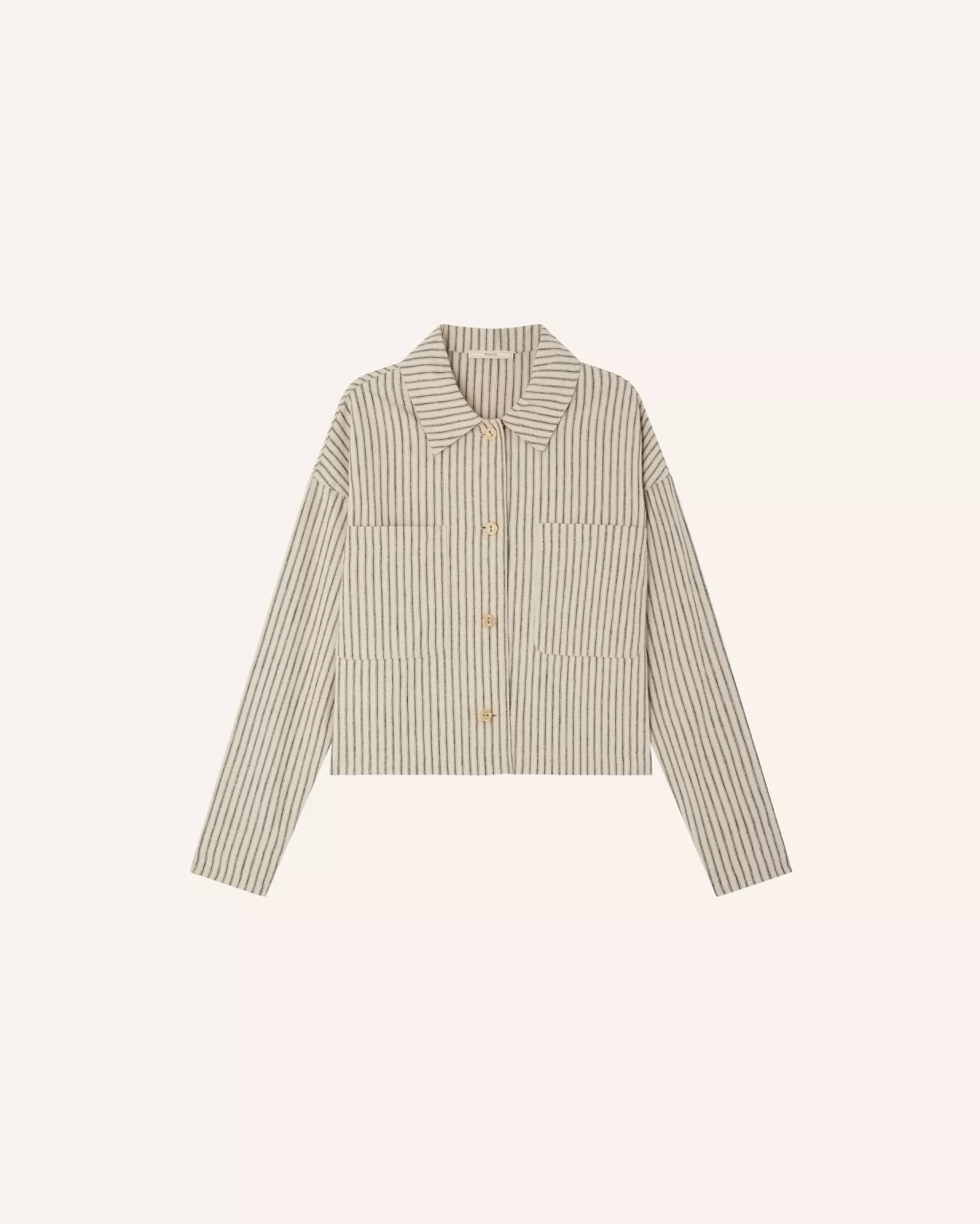 Overshirt with patch pockets in a rustic weave fabric featuring two-tone zephyr stripes, finished in Spain.