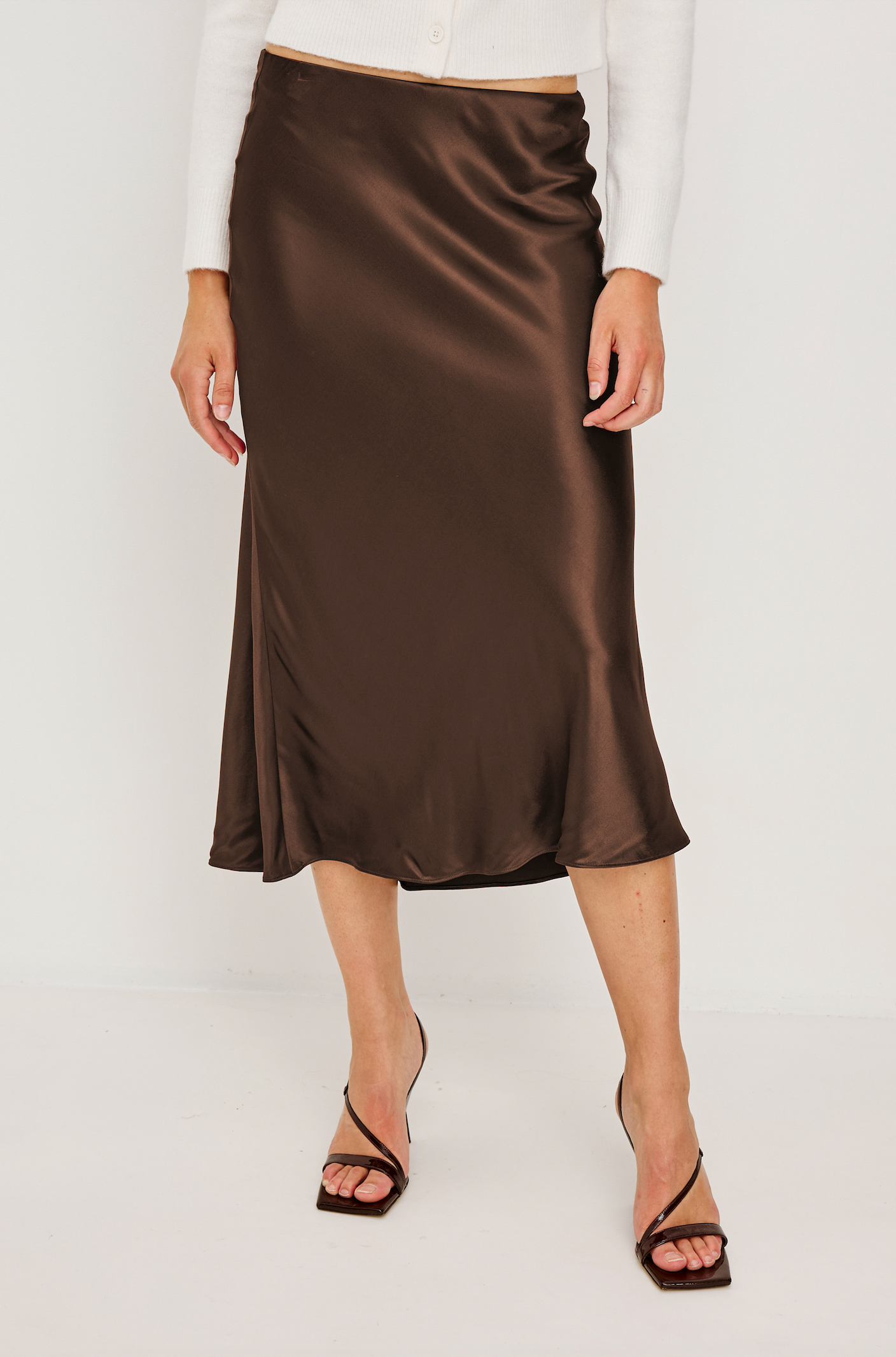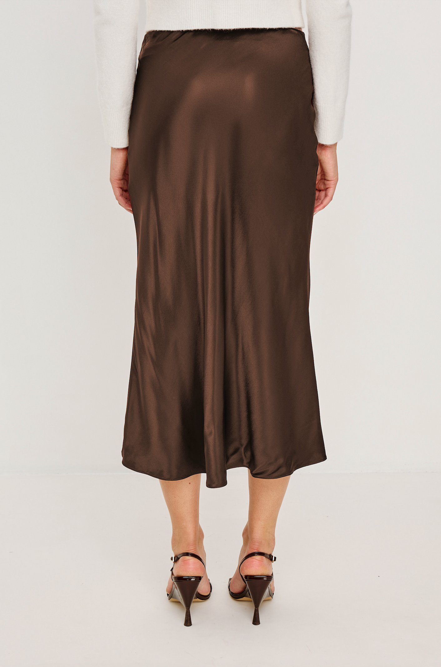 The Anya is a midi-length skirt with a concealed elastic waistband and satin crepe fabrication. Its high-waisted, pull-on design allows for effortless styling.
