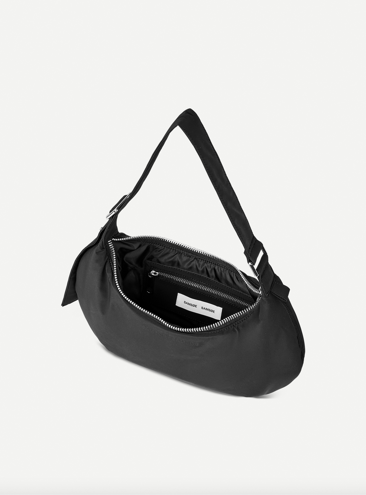 Shoulder bag with adjustable strap. Zipped closure at the top. Zipped pocket on the inside. Silver-toned hardware. Samsøe Samsøe branding on the front. Logo-branded key hanger on the outside. Main material and lining made from 100% recycled polyester. This product is GRS certified. Each stage of the supply chain has met strict social, environmental, and chemical requirements.