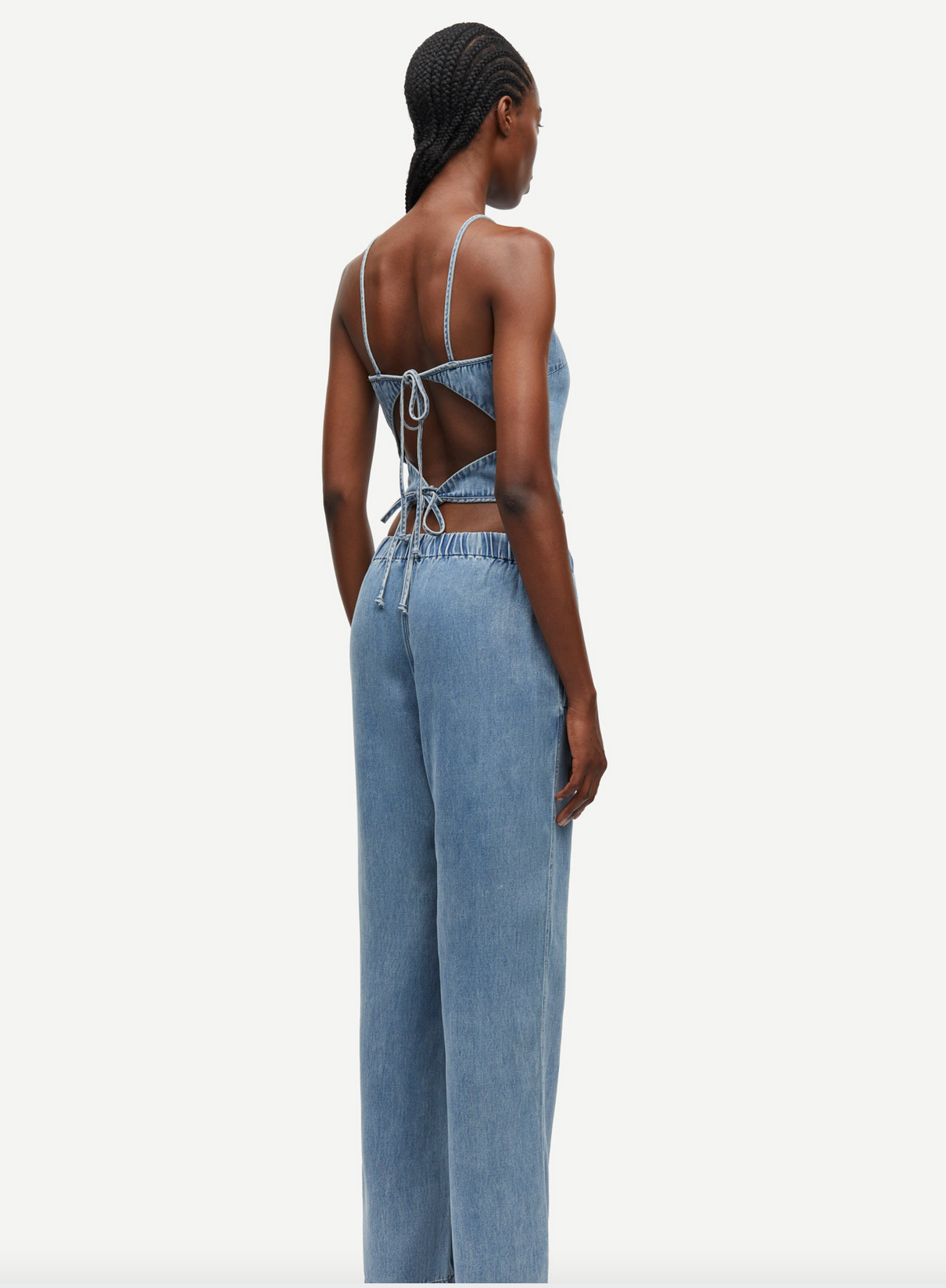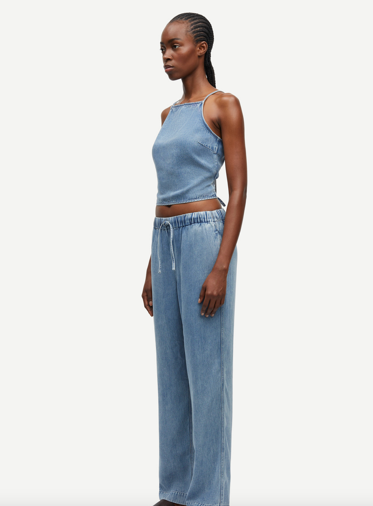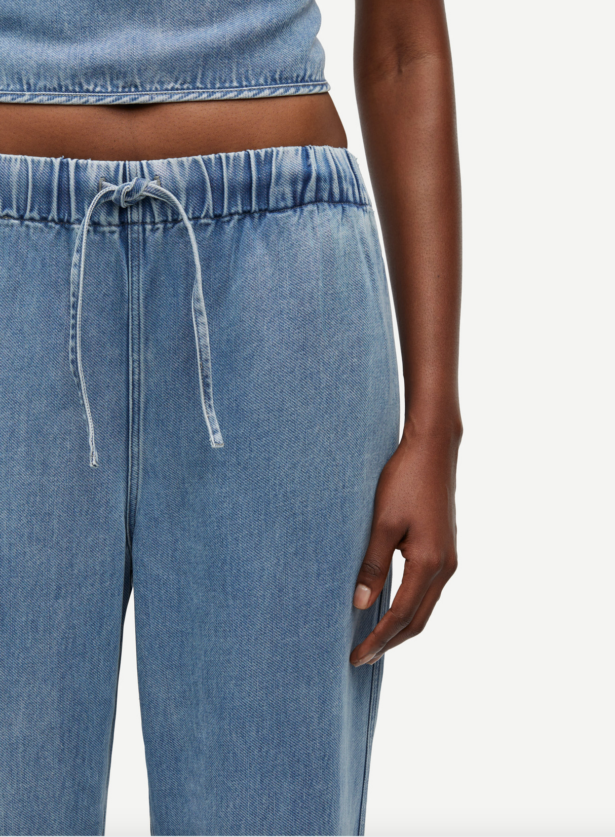 Mid-waist trousers with a regular fit and straight leg. Elasticated drawstring waistband. Side slit pockets on the front. Denim look. Main material made from 100% TENCEL™ Lyocell. This product contains TENCEL™ Lyocell, certified with the EU Ecolabel for textile products (licence no. AT/016/001) for environmental excellence.