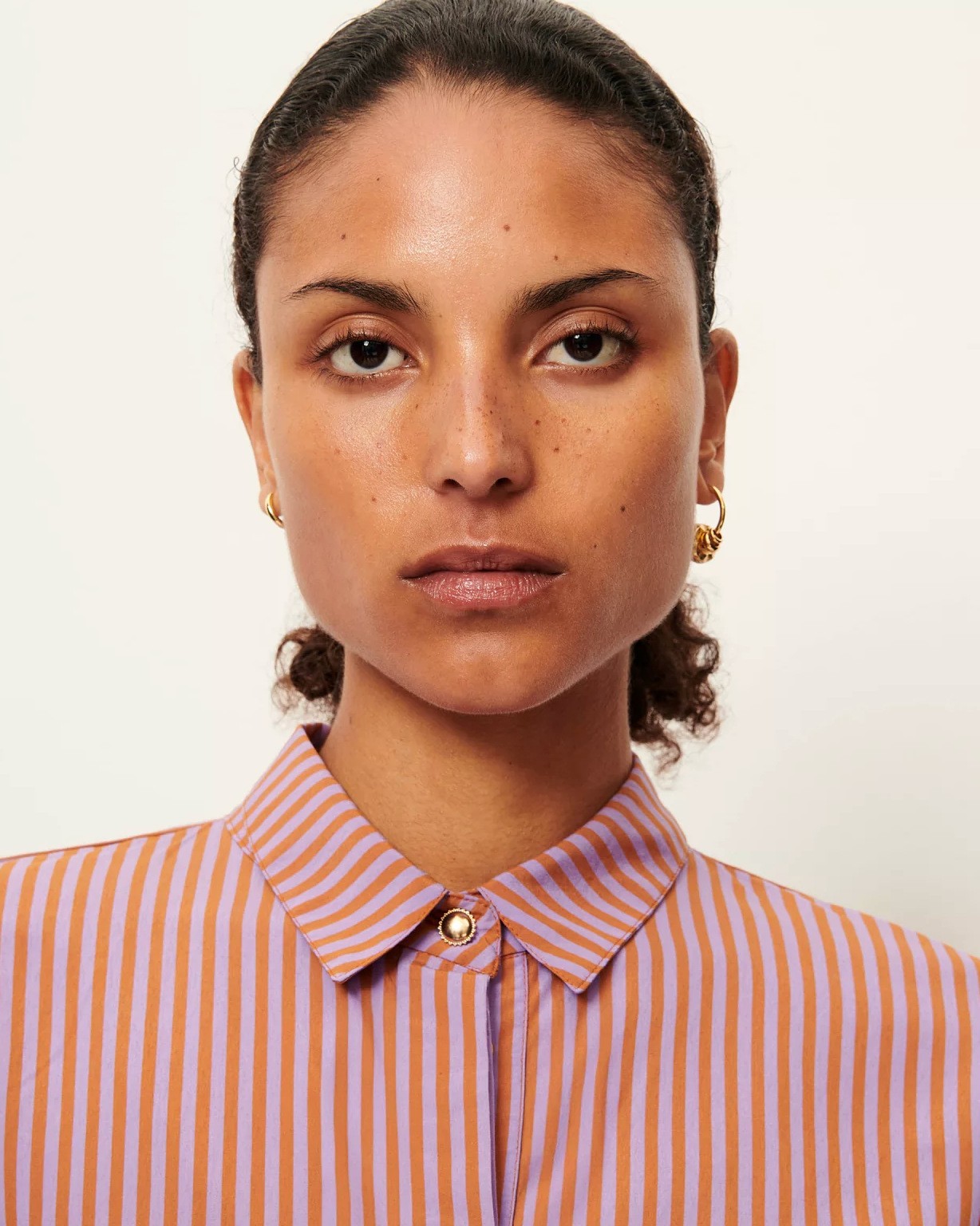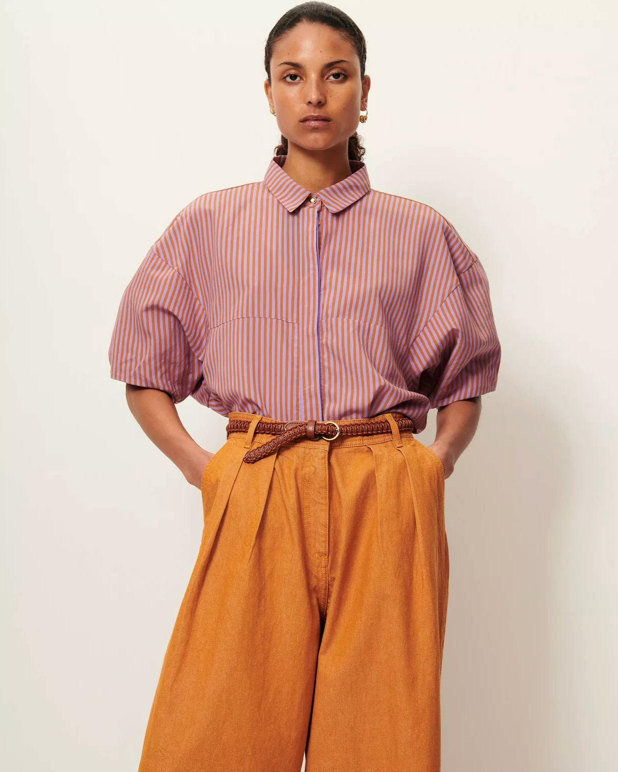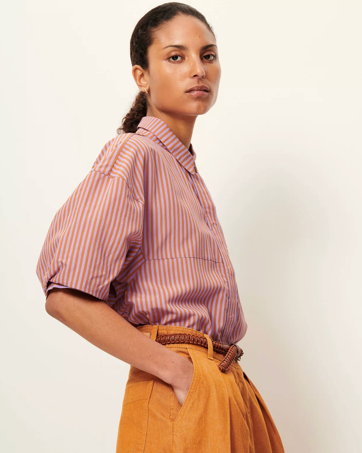Blouse with short balloon sleeves in a compact poplin with two-tone yarn-dyed stripes, woven in Italy, exclusive to Sessùn.