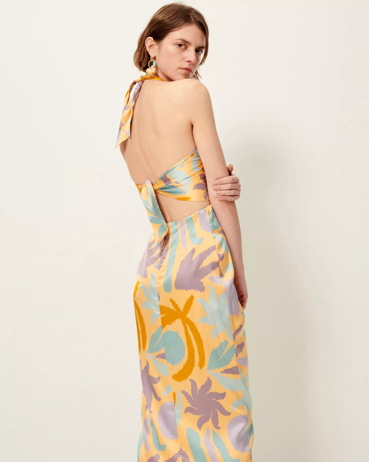 Form-fitting mid-length dress with a headscarf vibe in a fluid satin print fabric, woven in Italy, exclusive Sessùn pattern.