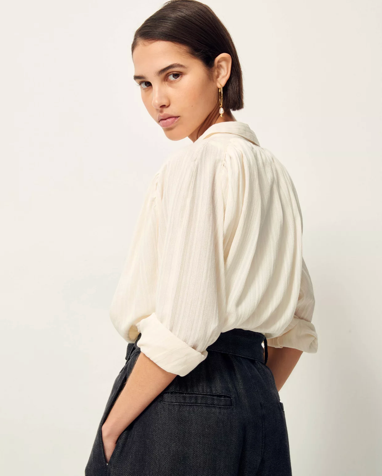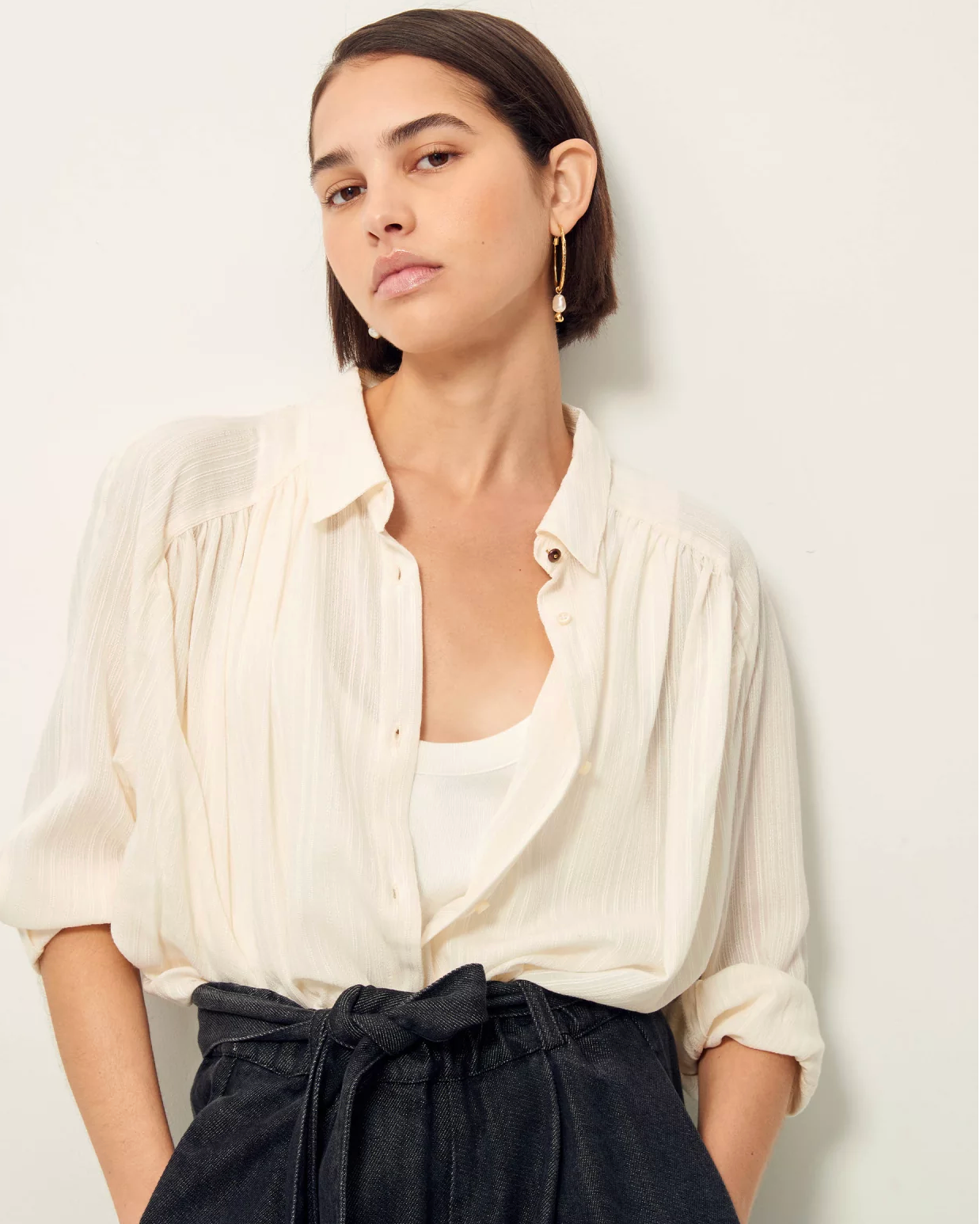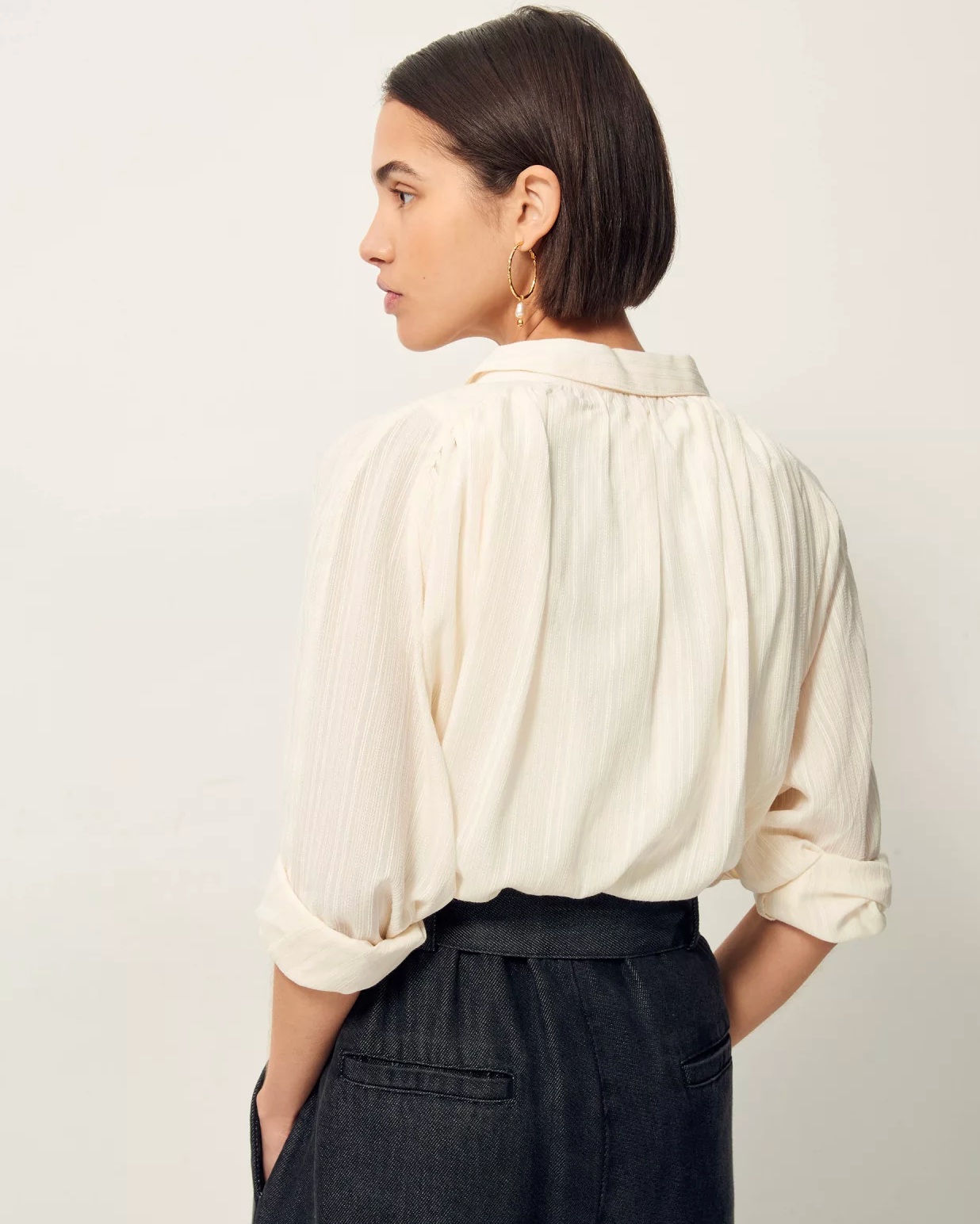 Gathered wide shirt in thin striped jacquard antic lawn woven in France, exclusive Sessùn.