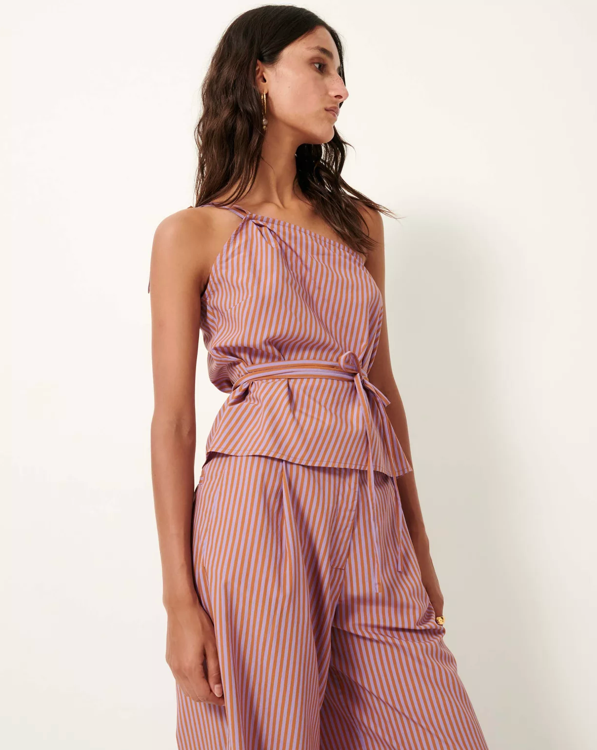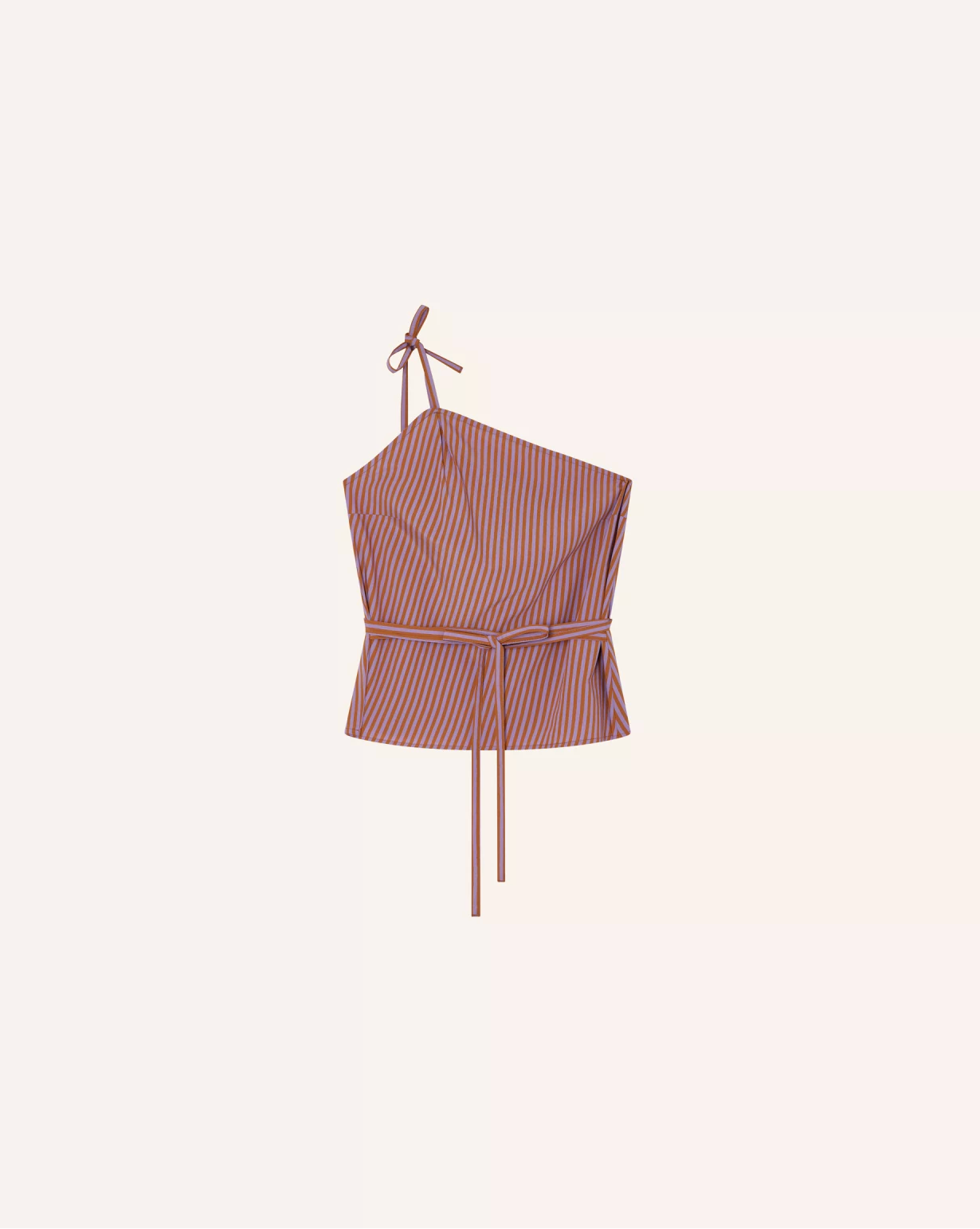 Top with an asymmetrical strap and waist ties in compact poplin featuring two-tone dyed yarn stripes, woven in Italy, exclusive to Sessùn.