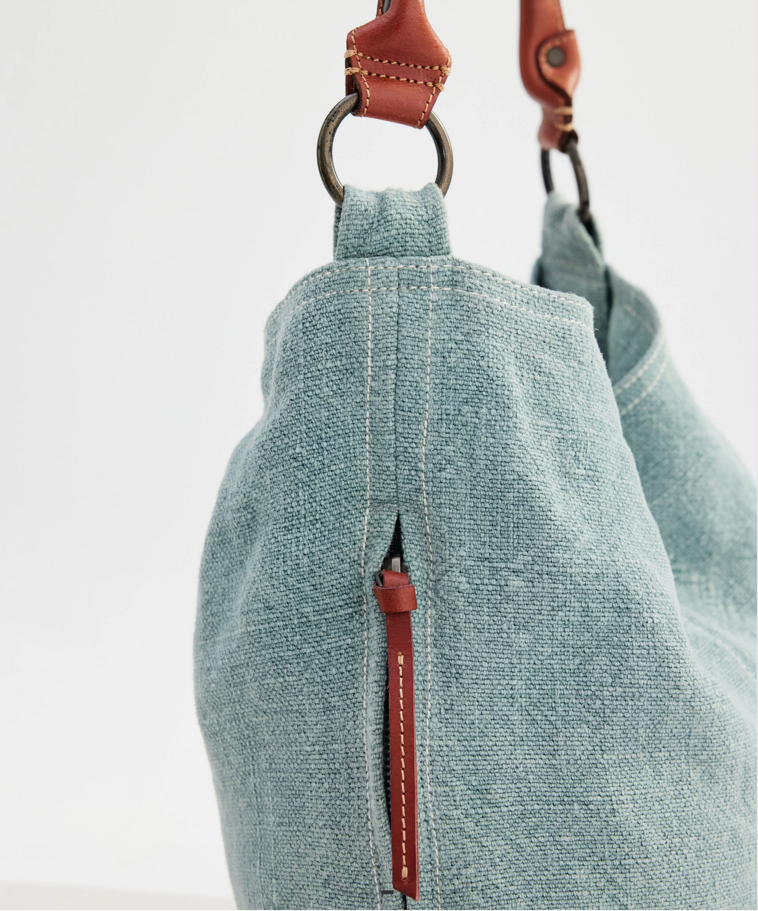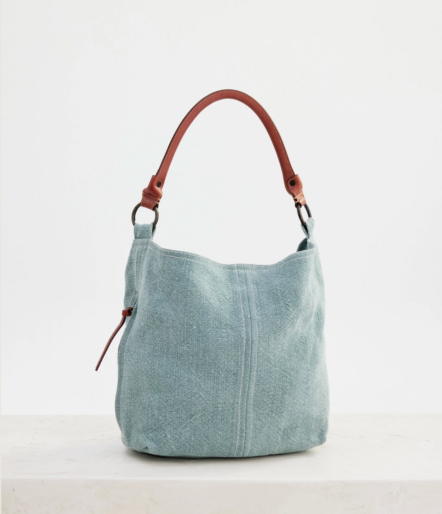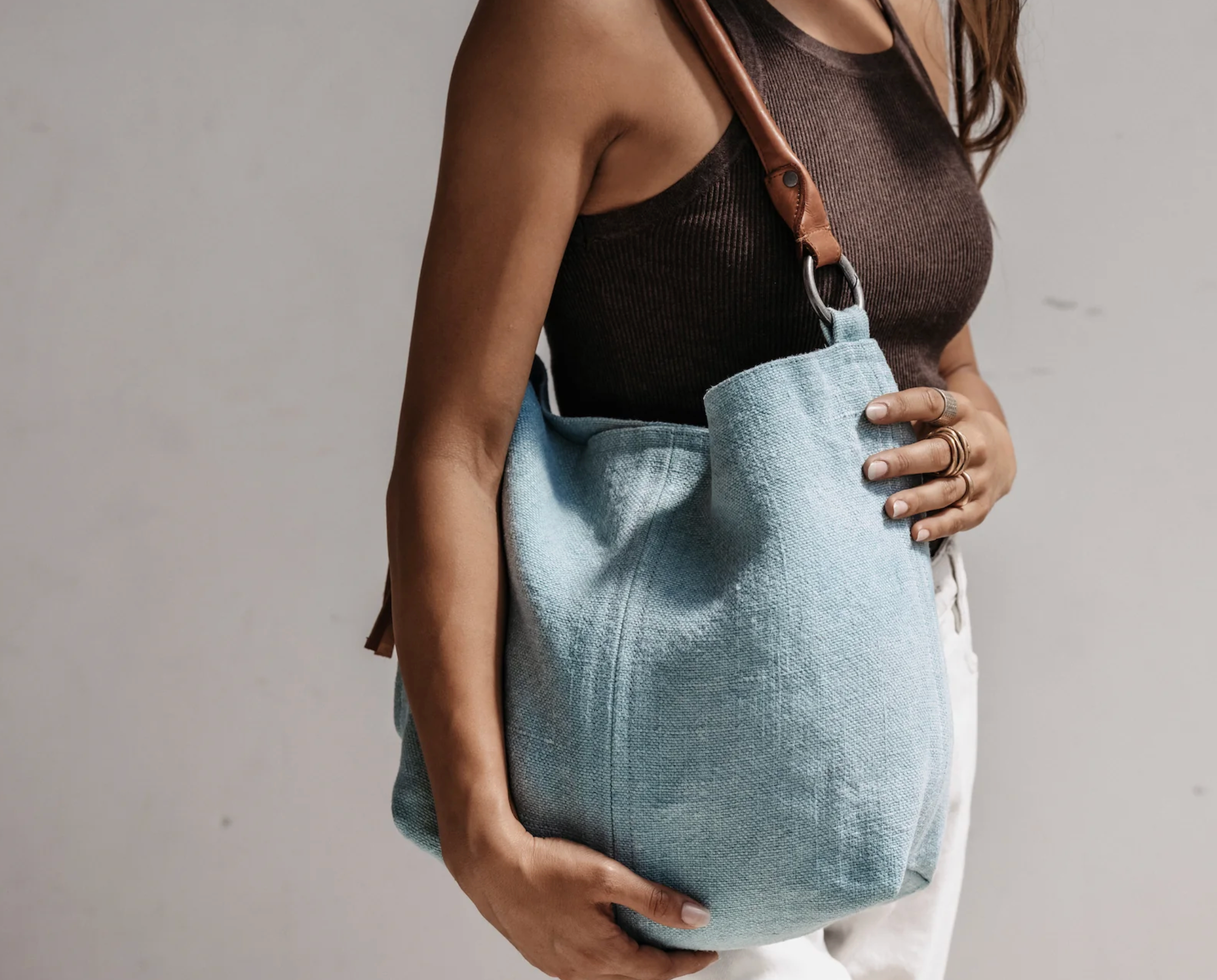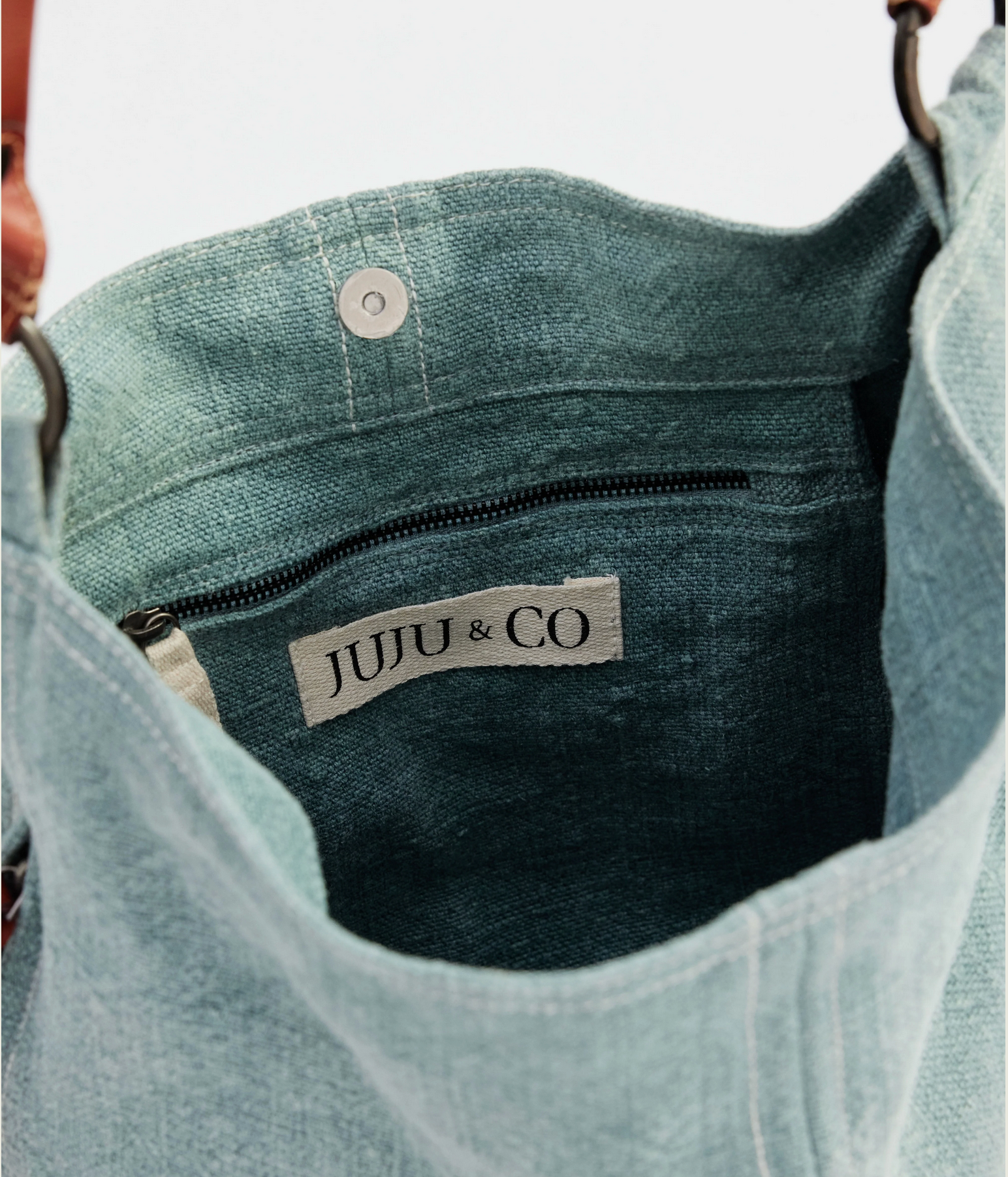 The Sunday Slouchy features our Baby Jute size body with a rolled Italian belt leather strap. The handle is detachable with a clip-on O-ring. It has a magnetic closure, internal zip pocket, and side zip pocket. Made from organic vegetable-dyed jute with an updated premium Italian belt leather handle.