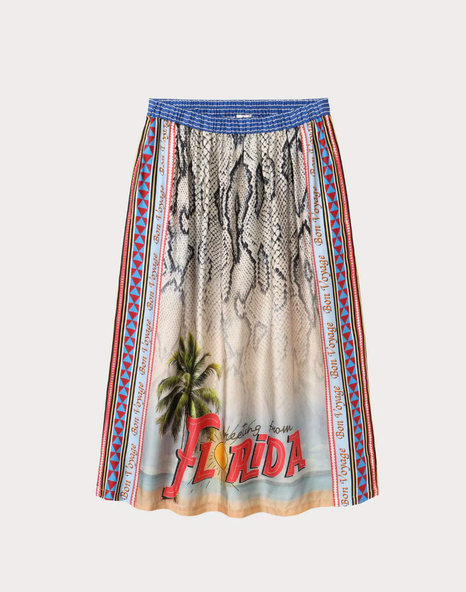 Elastic waist, flowy pleated midi skirt in our Snake Charmer print featuring a snakeskin print. Skirt reads “Greetings from FLORIDA” along the hemline. Pair with your favourite top for an eye-catching feminine look.
